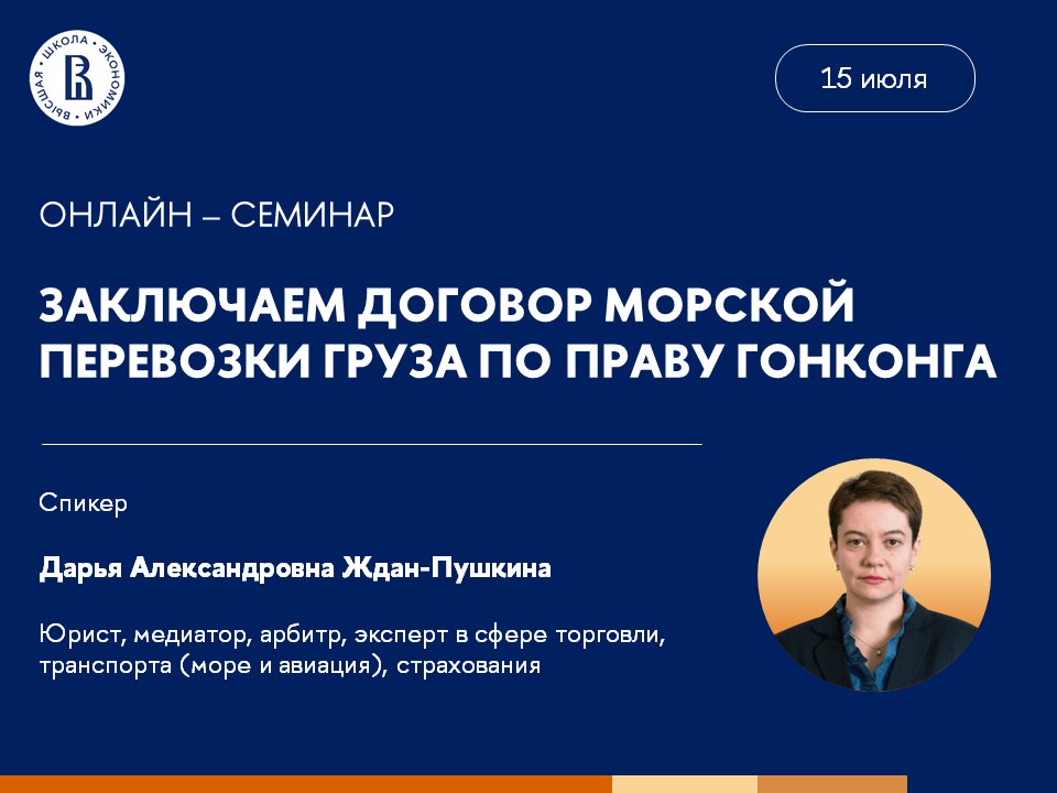 15 июля 2025 г. НИУ Высшая школа экономики и Дарья Александровна Ждан-Пушкина, руководитель Юридического офиса Дарьи Ждан-Пушкиной, Исполнительный директор Центра медиации “Solis”, ведущая программ образования по морскому арбитражу, контрактному праву Гонконга и бизнес-медиации, организовали вебинар, который был посвящен контрактному праву Гонконга, и в частности, регулированию договора морской перевозки.